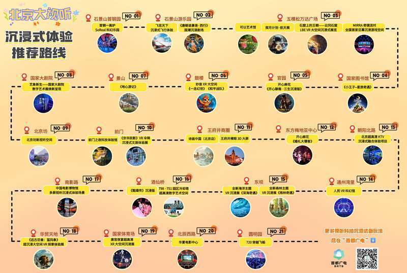 游客们在“潮马:都市风情路线”中,体验属于北京的时尚活力 city walk;在“密码:年代怀旧路线”中,循着光影走进怀旧场景,回味往昔年代的时光记忆;在“战马:红色爱国路线”中,探访红色影视取景地;在“戏码:超现场演出路线”中,体验各类超现场演出,感受舞台艺术与影视联动的独特魅力;在“编码:沉浸式体验路线”中,打卡超高清沉浸式体验场景;在“骏马:演员家乡路线”中,循着北京籍演员的足迹,走进他们的家乡区域,开启充满情怀的打卡之旅;在“车马:地铁打卡路线”中,以地铁为脉络,解锁影视取景地周边的城市漫游新玩法。
